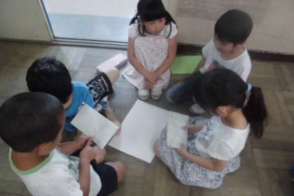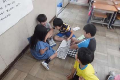 いよいよ明後日にせまった春の遠足。今日は,遠足で一緒にクイズラリーをする1年生との顔合わせをしました。1枚の地図を広げて,「ここ行きたい。」や「この道で行こう。」と話し合っていました。