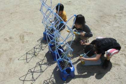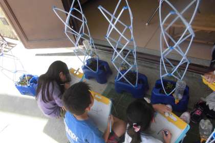 先日苗植えをしたミニトマトの観察をしました。葉っぱをさわったり,においをかいでみたりと,目だけじゃなく手や鼻も使ってミニトマトの生命を感じました。葉っぱをさわって「おもったよりざらざらしている。」という声も聞こえました。写真や動画ではわからない実物の良さを感じ取っているようでよかったです。