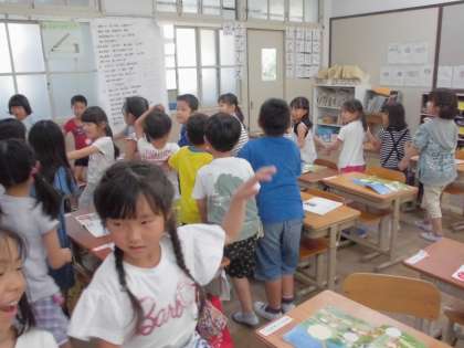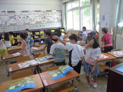 仲間を見つけて,握手をし,二人でまた教室の中を歌を歌いながら散歩しました。