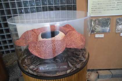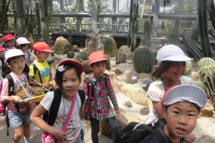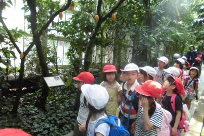 クイズラリーが始まりました。初めに子どもたちを待ち受けていたのは,臭くて有名な「ラフレシア」です。子どもたちも「おぉ〜。」と水槽をまじまじ見ていました。他には,みんな大好きチョコレートの原料「カカオ」,これは説明したら「へぇ〜。」と月並みな返事が・・・ なにはともあれ,1年生と手を繋いで,仲良く温室見学をしていました。クイズの答えを探しながらも,大きな植物たちに驚いていました。