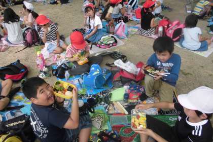 待ちに待ったお弁当の時間です。1年生と仲良くレジャーシートを広げて「いただきます。」の声があちこちから聞こえてきました。おいしいご飯に自然と口角が上がって『笑顔』いっぱいのランチタイムになりました。