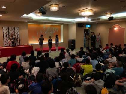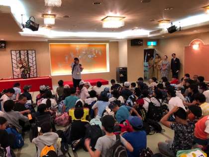 まるふくでの絵付け体験の後,本日の宿舎竜宮ホテルに到着しました!確かに内装が竜宮城っぽいですね。素敵なホテルです。入館式を終えて部屋のほうに入っていきます。ドアを開けて,部屋の中に入る瞬間がこれまたたまらないんでしょうね。「絵〜にも書けな〜い美しさ〜♪」かな。