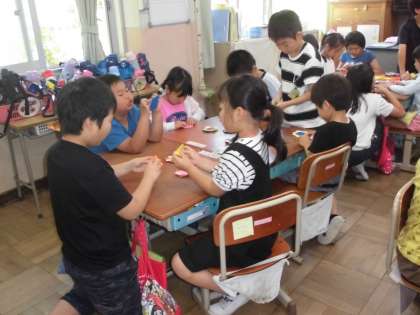 完成すると,とっても満足そうな顔をしてコマをまわす子,もう一つ作るといって折り紙を取りに行く子といろいろでした。