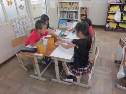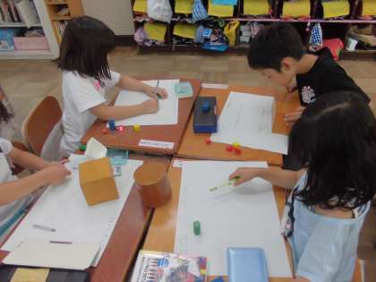 今日の算数の授業では,はこの形やつつの形などを紙に移して絵を描きました。