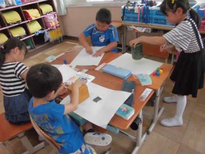 はこの形,つつの形,三角の形から一つを使って絵を描いている子,いろいろ組み合わせて絵を描いている子,みんな楽しそうに学習しました。