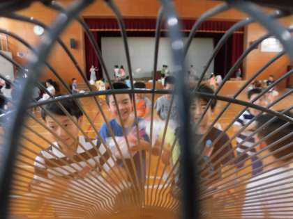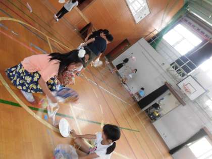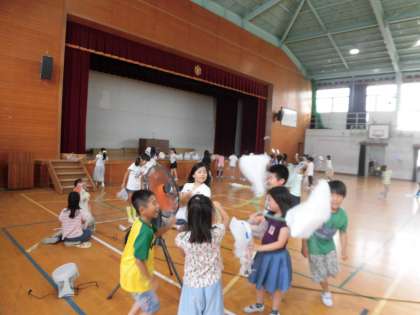 扇風機だけでなく,うちわを使ってがんばってとばす子ども達。とても暑かったので,みんな汗びっしょり!!ついでに自分もパタパタあおいでいました。