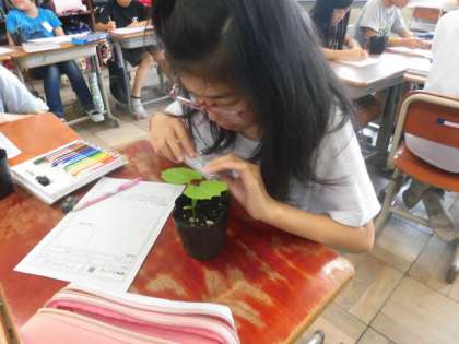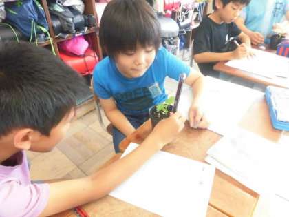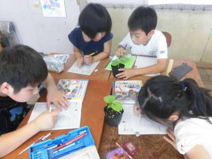 「こっちの葉っぱ,あっちのと比べて3センチも大きい!」や「ここの葉?みたいなんはなに?子葉?」,「でも先生,“まきひげ”はまだでてきてないわ。」の声も♪これからも太陽の光と水の恵みをえて,どんどん大きくなぁーーーれ♪