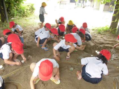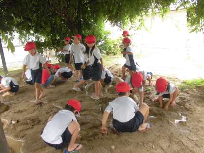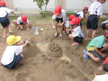 今日の図工の時間に,プリンカップを使ってお城やタワー,ドームなど作ったり,山を作ってトンネルをほったり,ほかの班の人と道をつなげたりしました。そして,作った道に水を流して,水がどのように流れるて行くのかを興味津々でじっと見つめていました。そして,自分のところに水が流れるように道を深くしたり,さらにほかの道につなげたりと工夫していました。