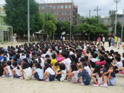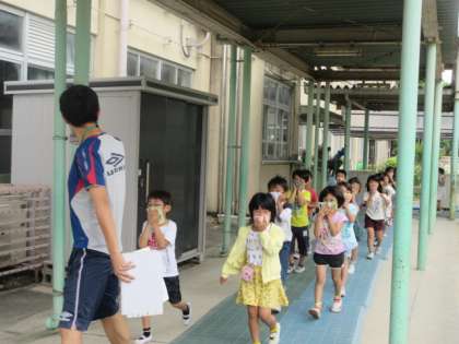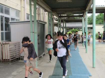 今年度1回目の避難訓練は,地震が起こり,その後火災が発生したという想定で実施しました。地震発生の合図から全校が運動場に避難してくるまで,各学年とも「お・は・し・も・て」(おさない・はしらない・しゃべらない・もどらない・ていがくねん優先)を実践し,真剣に取り組むことができました。