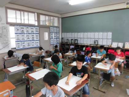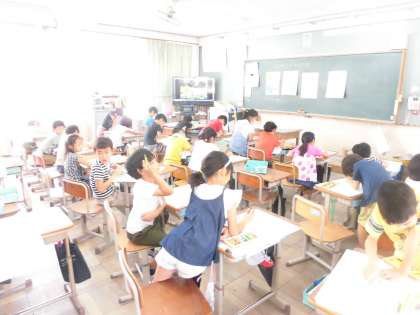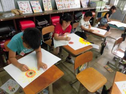 まずは種の部分をクレパスを使ってコンコン塗り!写真を見ながらどんな色を使えばきれいなひまわりになりそうか,想像しながら描きました。色を重ねたり,花びらの大きさや向きを工夫したりしていました。自由参観の頃には,教室にきれいなひまわり畑が広がっている(予定です…)と思います。その際は,ぜひご覧になってください!