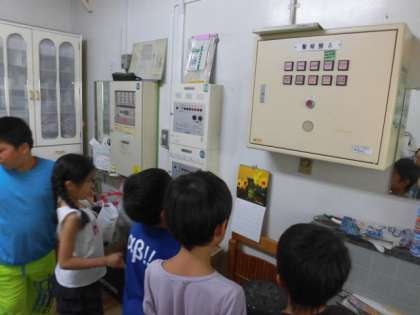 学校にはどのような消防設備があるのだろうか?消火器,非常ベル,防火扉,火災報知器,熱感知器…などたくさんのものを見つけることができました。中でも,どこで被害がでたかを知らせてくれる受信機ははじめてみるので,子どもたちも「なるほどー!これで,逃げ方がきまるのか!」と関心していました。