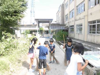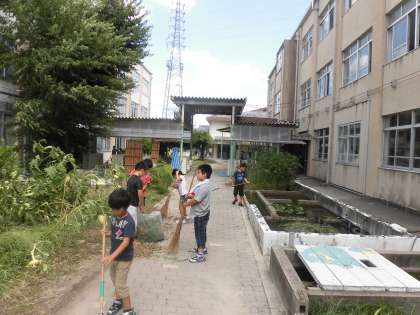 先日の台風の影響で散らかってしまった中庭をみんなで大掃除!