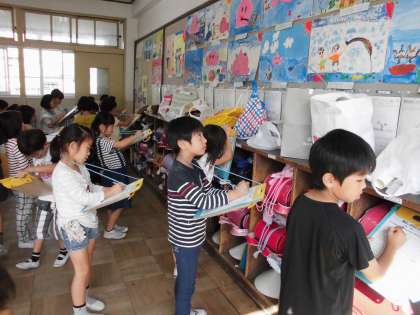今日の図画工作科では,先日制作を終えた「お話の絵」を学年で鑑賞しました。学級によって扱った図書が違ったため,だれがどのような作品を選んで絵を描いたのか子どもたちはまさに興味津々で,じっくりと作品を見つめる姿がたくさん見られました。