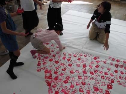 今日の図画工作科では,学年で学習発表会に向けた道具作りを行いました。ビニール袋を用いた衣装づくり,学年みんなの手形で作る“大きな魚”,「スイミー」に登場する海の生き物たち…。みんなで力を合わせ,少しずつ準備が整ってきました。
