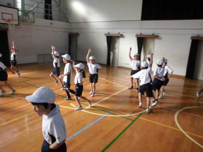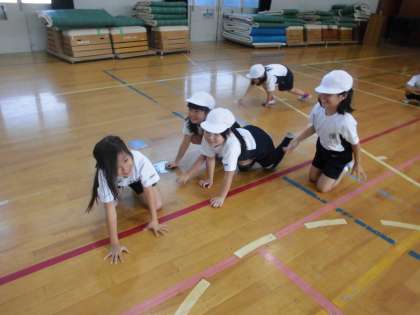 今日の体ほぐし運動では,“動物”になって体をほぐす活動を行いました。先日の遠足で訪れた動物園で見た動物を思い起こしながら,ライオンやゾウ,キリンなどになりきる子どもたちはとても楽しそうで,すっかり動物になりきっていました。また,数名の友だちと列になって行うおにごっこも行い,こちらもドキドキハラハラした様子で活動する子どもたちの元気な姿を見ることができました。