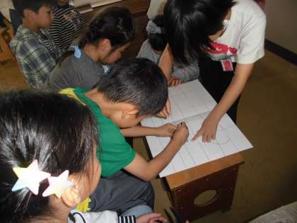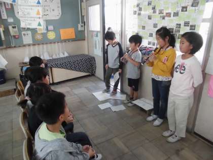 今日は3年生と国語の授業で交流をしました。3年生は、国語「伝えよう 楽しい学校生活」の学習として,3年生になって新しく学習したことを1年生分かりやすく伝えるてくれました。算数のコンパス,音楽リコーダー,社会で学んだ地図記号のこと,理科「かぜとゴムのはたらき」,書道体験などがありました。1年生のために一生懸命伝えてくれる姿に「早く3年生になって、ぼくもリコーダーを吹いてみたい。」「書道が楽しかった。」などの声が上がっていました。3年生、ありがとう!