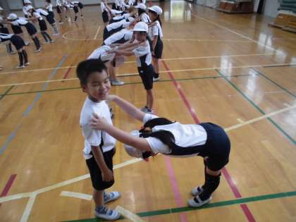 先週に引き続き,今日も体育科で「体ほぐし運動」に取り組みました。今回は,二人組での体ほぐしを中心に行い,後半はペアや三人組,学年全体での“しっぽ取り”も行いました。これまでの学習で,たくさんの体ほぐしを学んできた2年生の子どもたち。体を動かす前などの様々な場面で,ぜひ活用してほしいと思います。