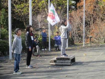 まず,最初に入所式。美しい歌声で校歌を歌いながら,自分たちで作った旗を揚げました。旗には「本気獏発」とみんなのやる気がいっぱいの言葉が書かれています。