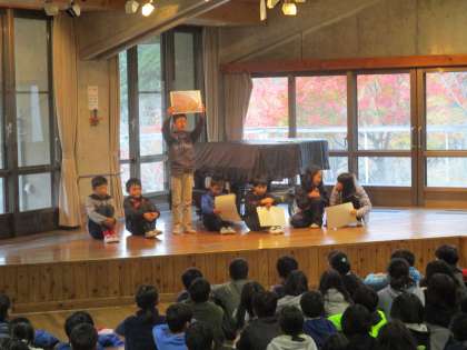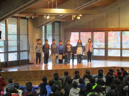朝の集いは七条小学校との合同の集いでした。まず,山の家の先生から,フィトンチット(森の香り)のお話を聞きました。森の香りで浄化されたり,癒されたりするそうです。