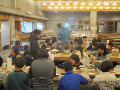 山登りの後は室内で少しゆっくり。いや,ゆっくりしていない子どももたくさんいましたが(笑)。腹ペコを我慢して我慢して,遂に来ました夕食タイム。食事係の手際のよさもあって,本当に全体の動きがスムース!みんなパクパク口に頬張ります。やっぱりプチハンバーグとエビフライ,一口餃子は人気でした。