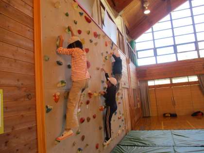 午後からの活動はクライミングとボルタリング。初体験の子どもがほとんどです。最初は恐る恐るですが,すぐにコツをつかんで慣れていきます。やっぱり子どもはすごい!