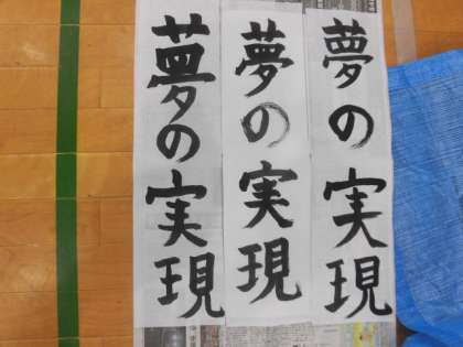 10日(木)の3,4時間目に学年合同の書き初め大会を行いました。文字の大きさや組み立て方,行の中心に気を付けて『夢の実現』という言葉を書きました。