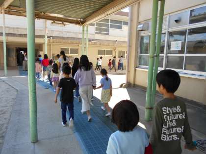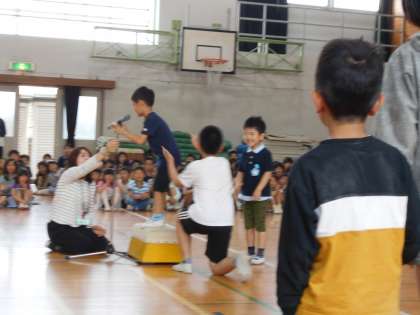 6年生と手をつないで入場し,マイクで自分の名前を全校のみんなに言いました。各学年の発表のあとは,感謝の気持ちを使える1年生の番です。学年目標にもある「おひさま」が出てくる歌を歌いました。初めての学校行事で緊張もしていましたが,みんなとってもがんばって発表できました。