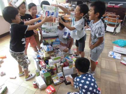 図工の時間に、集めてきた箱を使って、「いろいろな はこから」の造形遊びをしました。初めのうちは、箱をどんどん積み上げてはくずれを繰り返していましたが、次第に周りのグループと競争をしたり、どうしたら高く積みあがるかグループで話し合いながら積み上げていました。「大きいものを下にしよう。」や「周りををつっかえ棒でささえよう。」などそれぞれ工夫していました。しばらくすると、ただ積み上げるだけでなく、船やお城など何かの形を作っていました。丸い筒型のものや丸いものを転がすコースを作って、「ピタゴラスイッチや〜」と言いながら楽しんでいました。片づけまでばっちりできました。次はこの箱を使って、一人ひとり立体作品「はこで つくったよ」を作りたいと思います。
