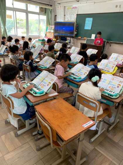 1年生は鍵盤ハーモニカ,6年生は体育館でバスケットボールの学習をしていました。