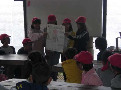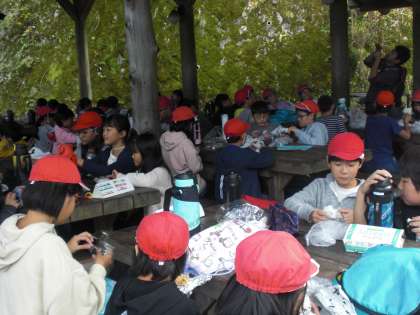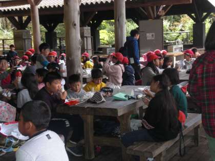 これからの活動について係りの人から話があり,その後,楽しみにしていたお弁当タイム。これから始まる活動を楽しみに笑顔で昼食をとっていました。「すごく楽しい。ロッジが楽しい」という声も聞こえてきました。