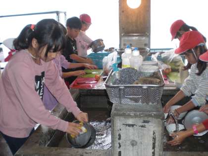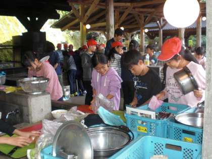野外炊事のそれぞれの係りに分かれて,準備を始めました。煙のあまり出ない上手な火のつけかたを山の家の先生に教えてもらったり,食器をきれいに洗ったり,みんなやる気いっぱいです。