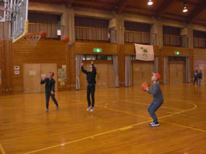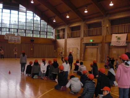 午後からはプレイホールでの活動。プレイホール前に集合。その後,まず,ドリブルシュートリレーをクラス対抗でやりました。どのクラスも友達がシュートしている時,温かく見守り,シュートが決まったら歓声が上がっていました。ナイスシュート!