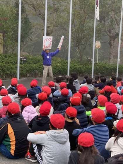 今日の朝の集いは,3校合同で行いました。この山の家で共に過ごしている西院小・下鴨小との合同です。