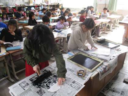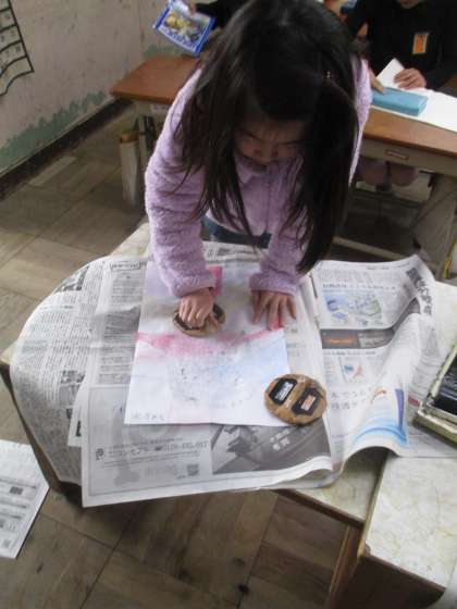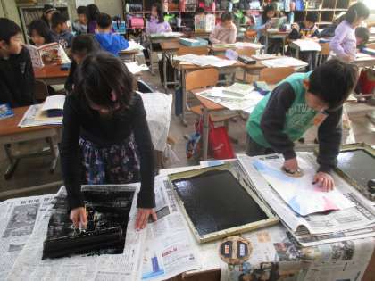 図工科の「たのしく うつして」の学習で作っていた紙版画を刷りました。