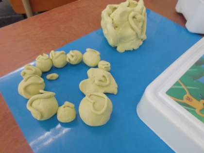 図画工作科の学習では,粘土を使ってごちそうを作りました。ドーナツ,ピザ,ケーキ,おすし,ハンバーガーとポテトのセット・・・。それぞれが食べたいものを細かいところにも気を付けて作りました。「お腹空いてきたー!」「食べたくなってきた!!」という声がありました。
