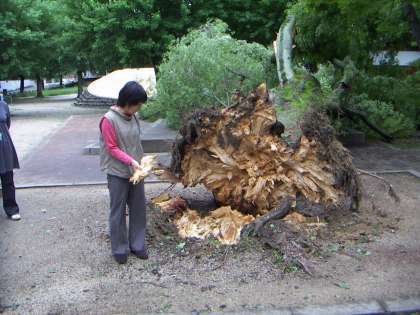 台風2号による昨晩の風で,三反田公園の一番大きな木が倒れました。