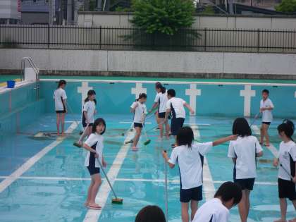 今年もこのシーズンがやってきました。水泳学習のスタートを前に、6年生がプール清掃をしてくれました。2・3・4時間目にクラスごとでプールの中、壁面、プールサイドなときれいにしてくれました。手に手にたわしなどを持ってごしごし汚れを落としてくれています。ヤゴやアメンボなどを見つけて、バケツに集めていました。いよいよ来週から低学年の水遊びが始まります。