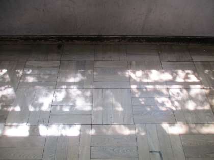 木にあたって,ひかりが いろいろなかたちになって ゆかにうつっているのです。