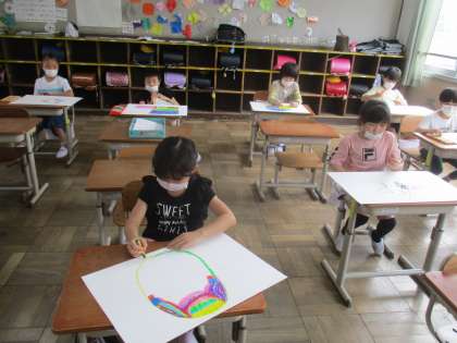 休校中にアイデアスケッチをしていた図画工作科の「ひみつのたまご」のたまごを描きました。大きな画用紙に黙々と,真剣に,思い思いのたまごを描きました。続きが楽しみです。