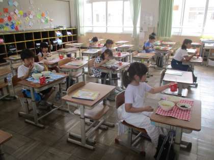 給食の前に,これからの給食についてみんなで確認をしました。手洗いをしっかりすること,配膳の仕方,前を向いて静かに食べるなど,気をつけることはたくさんありましたが,大きな混乱もなく,美味しい給食の時間を過ごすことができました。