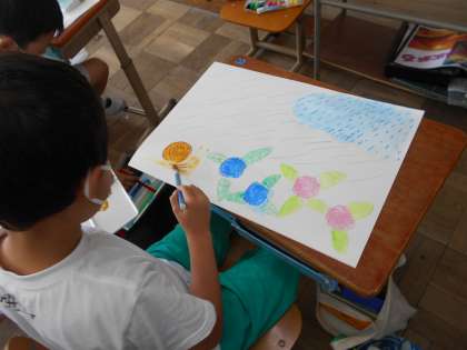 前の学習で学んだ,色を薄くしていくことと色を出会わせることを使い,6月の絵を描きました。アジサイやカタツムリが登場して,自分が考える雨を降らせました。