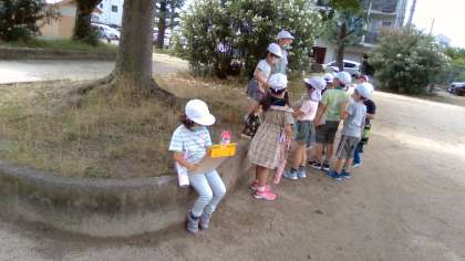 今日は,生活科「なつだ とびだそう」の学習で,午塚公園に行きました。初めての探検ボードを使って 見たものを直接絵にできました。描きたいものがたくさんある様子で,いろんな生き物や植物に目を向けられました。