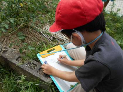 生活科の学習でミニトマトの観察をしました。葉が生い茂り,実もたくさんなっていて,ぐんぐん成長しています。「もっと赤い実が増えてほしい!」という声もありました。