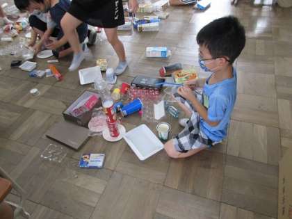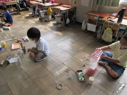 生活科の「あそんで ためして くふうして」の学習で,お家で集めたプリンカップやお菓子の箱,ペットボトルなどの廃材を使って,みんなで遊びました。
