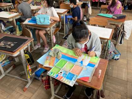 富士山や銀杏の木,大きな湖や電車などを,水彩絵の具やクレパスなどを使って着色しています。