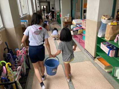 ほうきの使い方を教えてあげたり,一緒にバケツを運んだり,1年生が掃除の一人前になれるように頑張ってくれています。