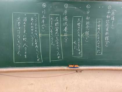 今回は,授業の中で,主人公の綾が,広島のどこを訪れ,その中でどんなことを知ったのかを学習しました。