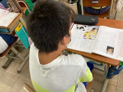5年生の教室をのぞくと,マンガ家手塚治虫さんを扱った道徳の授業が行われていました。