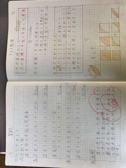 算数科「円の面積」や社会科「貴族のくらし・武士の世の中へ」のテストに向けて,自分なりにノートにまとめています。