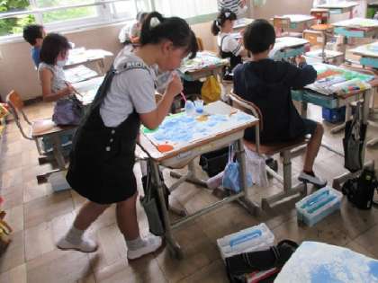 今日の図工の時間は,お話の絵の背景を絵の具で塗りました。